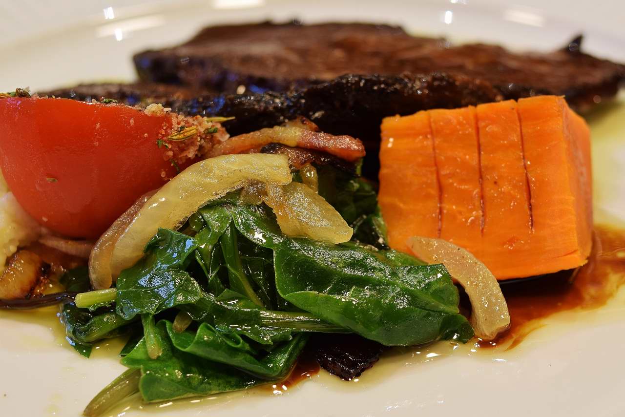 Butter the yam and drizzle with a few drops of molasses (or Karo syrup). Keep the yams warm@140 F/60 C. Fry the bacon until it is almost crisp. Slice the onions medium thickness and add to the bacon. Continue to fry slowly until wilted and slightly brown. Drain the greens well, toss with the bacon and onions, keep warm @140 F/60 C. Do not cover or the greens will darken. Cook the grits as directed on the packaging, S+P a pinch, and add a pat of butter. Keep warm @ 140 F/60 C Melt 2 oz/60g butter in a skillet, to 165 F/74 C. Add the slices of beef cheeks to heat, flipping once only to coat with the butter. This is an old-fashioned method. If you want to modernize it, use a microwave oven--be careful not to overheat. Season the half tomato with S+P. Dip the parsley sprigs in the melted butter.Arrange the ingredients on the plate as pictured: