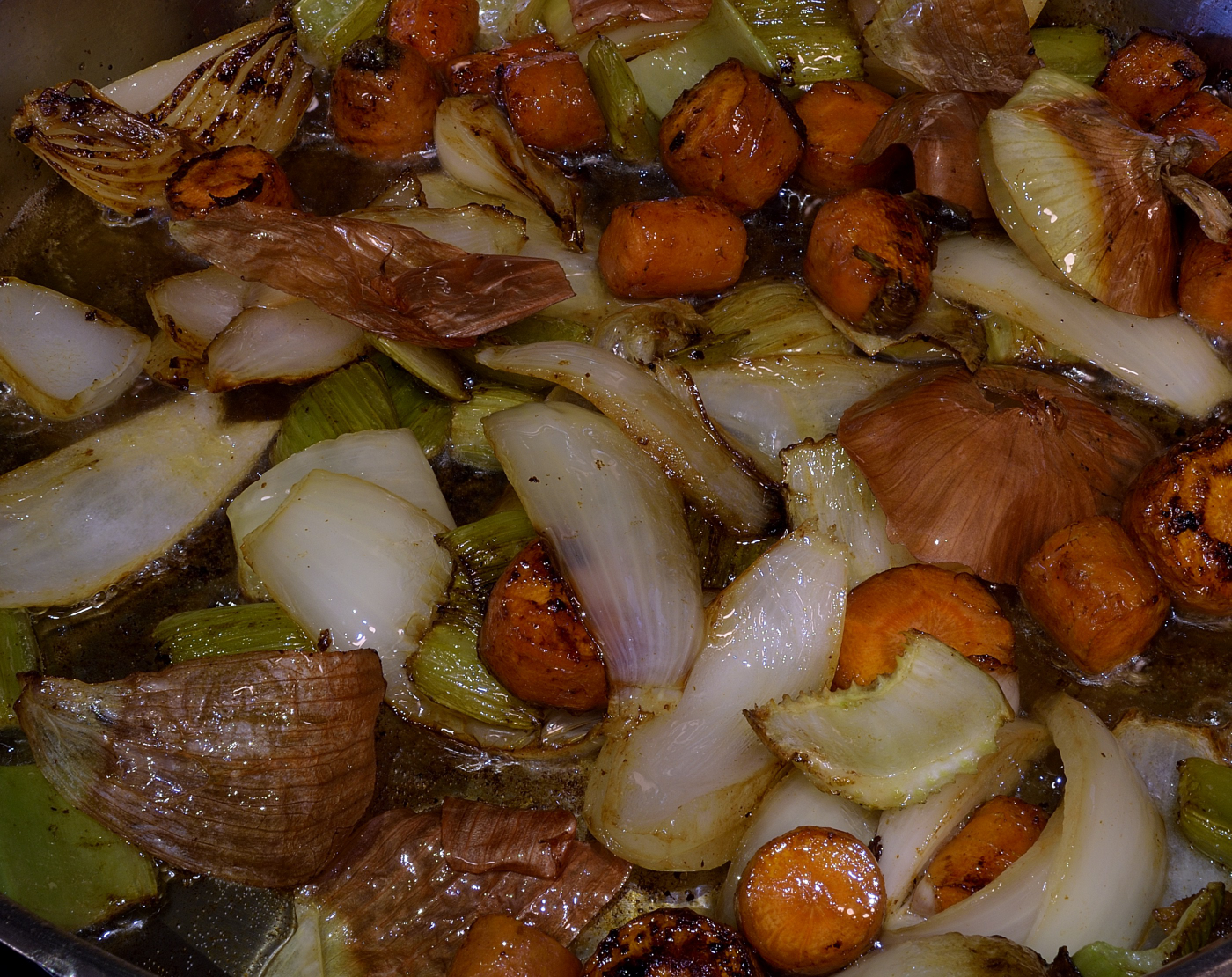 The vegetables should be fully cooked and brown on all surfaces. Patience is key.