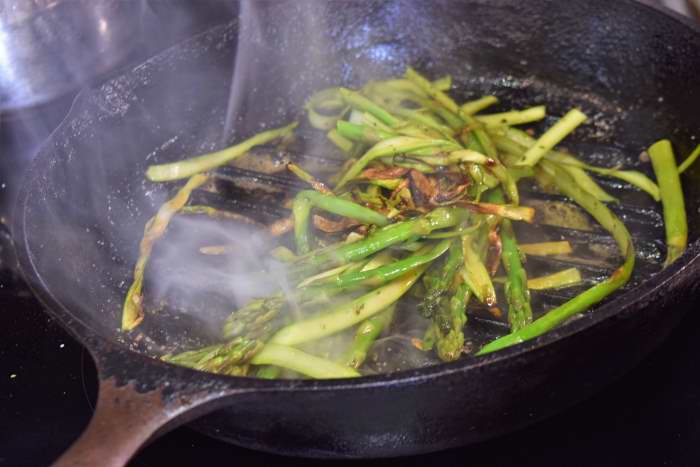 Toss the asparagus with a small amount of oil, just a few drops. Heat a large saute pan or grill pan, spread the ribbons out to an equal depth, and sear for a minute or two. A small amount of browning is acceptable, stir the asparagus around to make sure it is all exposed to heat. Remove to cool. If you keep the asparagus hot, it will overcook and blacken.
