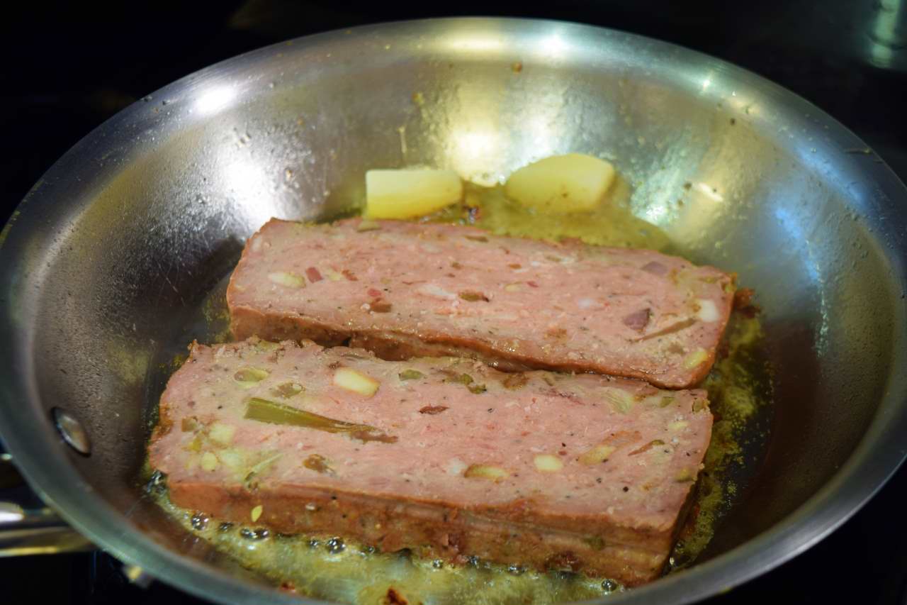 Using a paring knife. cut the potato, carrot, and celery into small pieces about the size of an olive. Heat a saute pan to 350F/177C, add a few drops of oil, and add the meat loaf. It should sizzle but if it pops turn the heat down a little. As it heats, you will see a little moisture appear on the top.