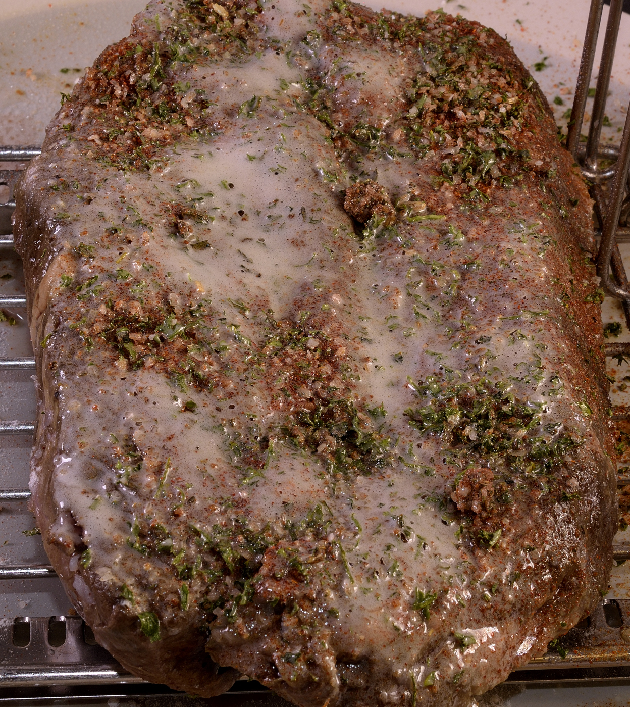 Remove the roast from the package--be sure to reserve the juices. Pat the roast dry and place on a clean surface. Next, we want to create an adhesive surface for the seasoned crust to cling to.
