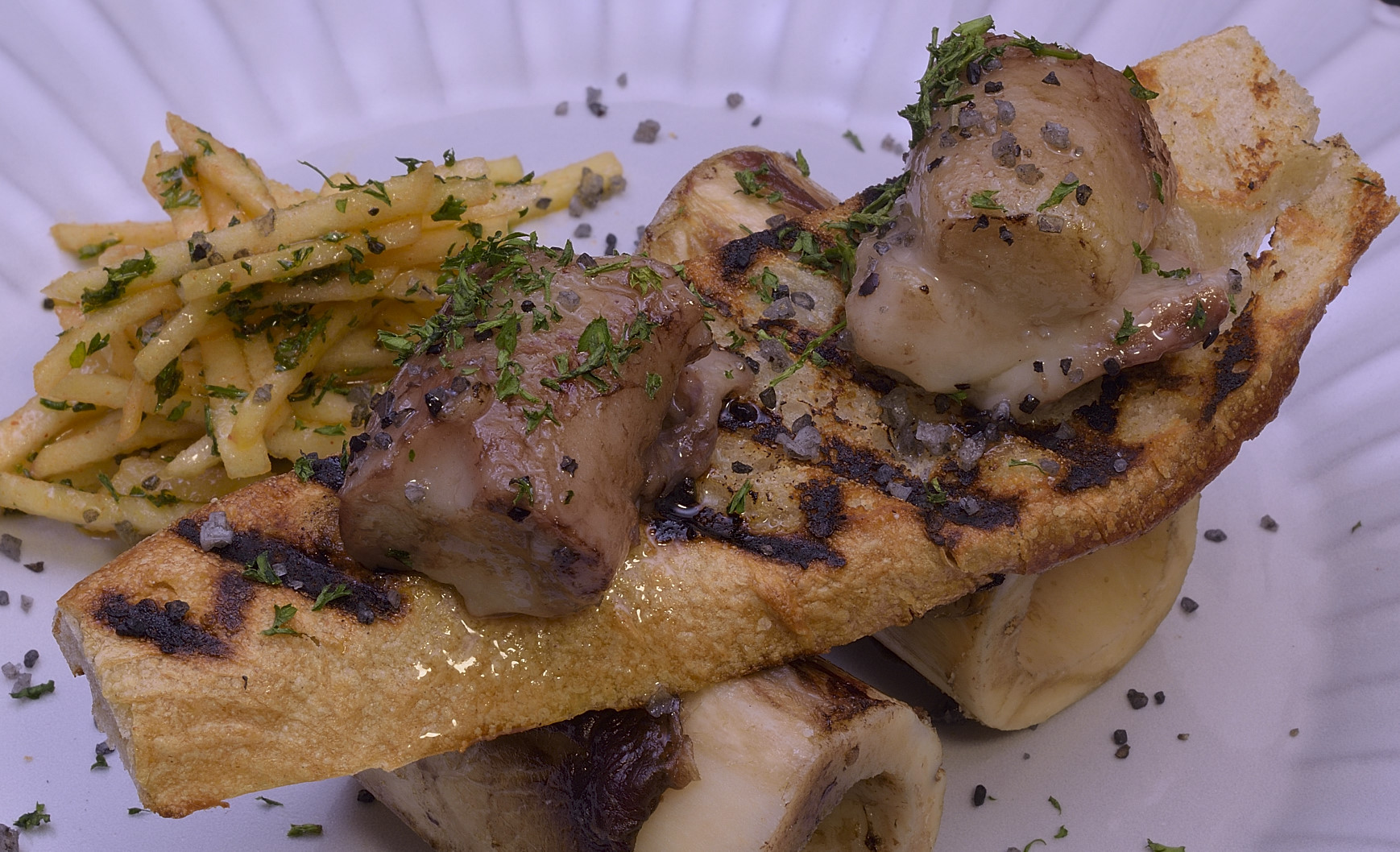 Another, slightly less esoteric model--the marrow is coarsely broken apart and distributed evenly over the crisped baguette.