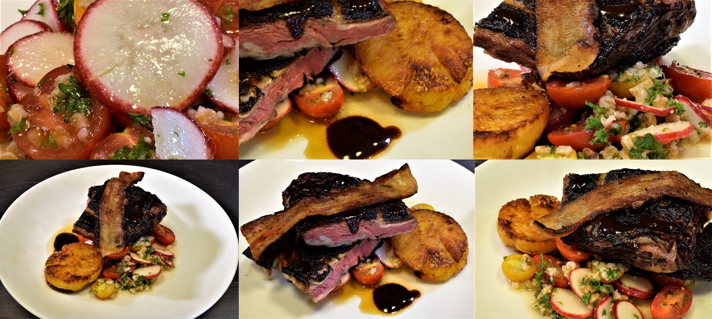Combine and toss lightly as described above: Cherry tomatoes, Radishes, Parsley, Barley, Extra virgin olive oil, Lemon juice, S+P.Keep in the refrigerator until service. Remove the steak from the smoker, and let it cool just long enough to carefully remove it from the rack. Heat a saute pan to 350F/176C, add a few drops of vegetable oil, and quickly sear the steak--it is already cooked, so we are just adding a little crust to the surface! This process should take about 30 seconds per side. Remove the steak from the pan, and place on a cutting board. Remove the salad from the refrigerator, and spoon some on to the plate, as pictured.