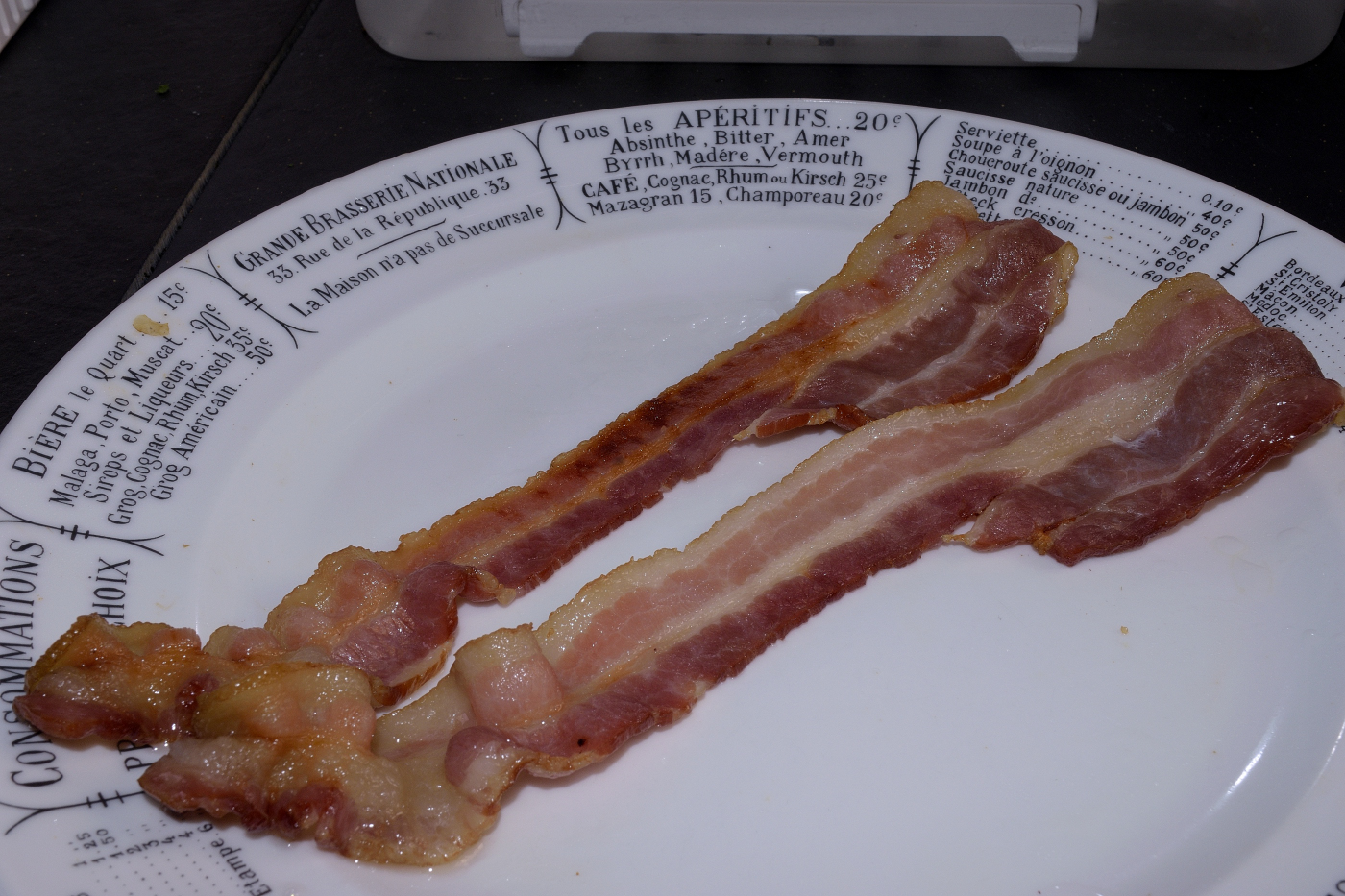 By the time uncooked bacon gets crisp, the steak may be overcooked. To prevent this, blanch the bacon first. Although this can be done in a pan, bacon has a tendency to curl up. The bacon can be partially cooked in the oven, but turning on the oven to soften a few pieces of bacon seems wasteful. One minute on a plate in a microwave oven does an excellent job. Putting a paper towel under the bacon helps to avoid splatter and to absorb the extra fat as it melts. Repeat the egg white coating process explained above on the bacon--this helps it stick to the steak.