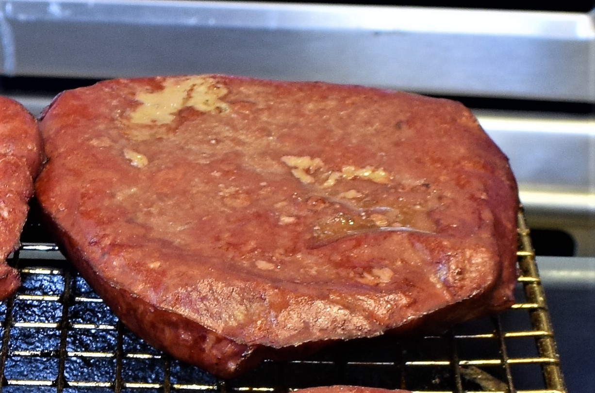 Forming of the patties and other key elements are discussed in detail in the original root article, linked HERE The patties were first individually processed: @129 F/54 C for 4 hours. Remove the burgers from the bath, and shock them to 70 F/21 C in iced water (in the bag), and refrigerate at 40 F/4 C. Why? Because if they enter the smoker @40 F/4 C, their journey to mouth hot will take much longer than if they enter the smoker @129 F. This allows for the maximum contribution of smoky goodness to the finished product. And that's what we want, right? Now you have a fully pasteurized and preserved patty. Larger patties will usually appear pale on the outside. Smaller ones may appear more gray. Inside, the meat will appear red and raw, but the texture is firm like a cooked patty,Smoking the patties"¦