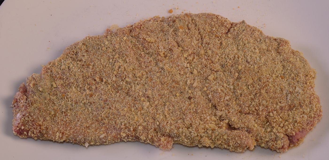 Heat a skillet or cast iron frying pan to 300F /150C Traditional recipes call for lard, which has its own flavor. Modern tastes have wandered towards vegetable oil--both are fine. Add enough oil to fully cover the bottom of the heated skillet--usually about 2 oz/60 ml. Carefully add a cutlet to the pan. For best results, cook one at a time, drain and strain the fat, wipe out the pan with a paper towel and repeat the process.