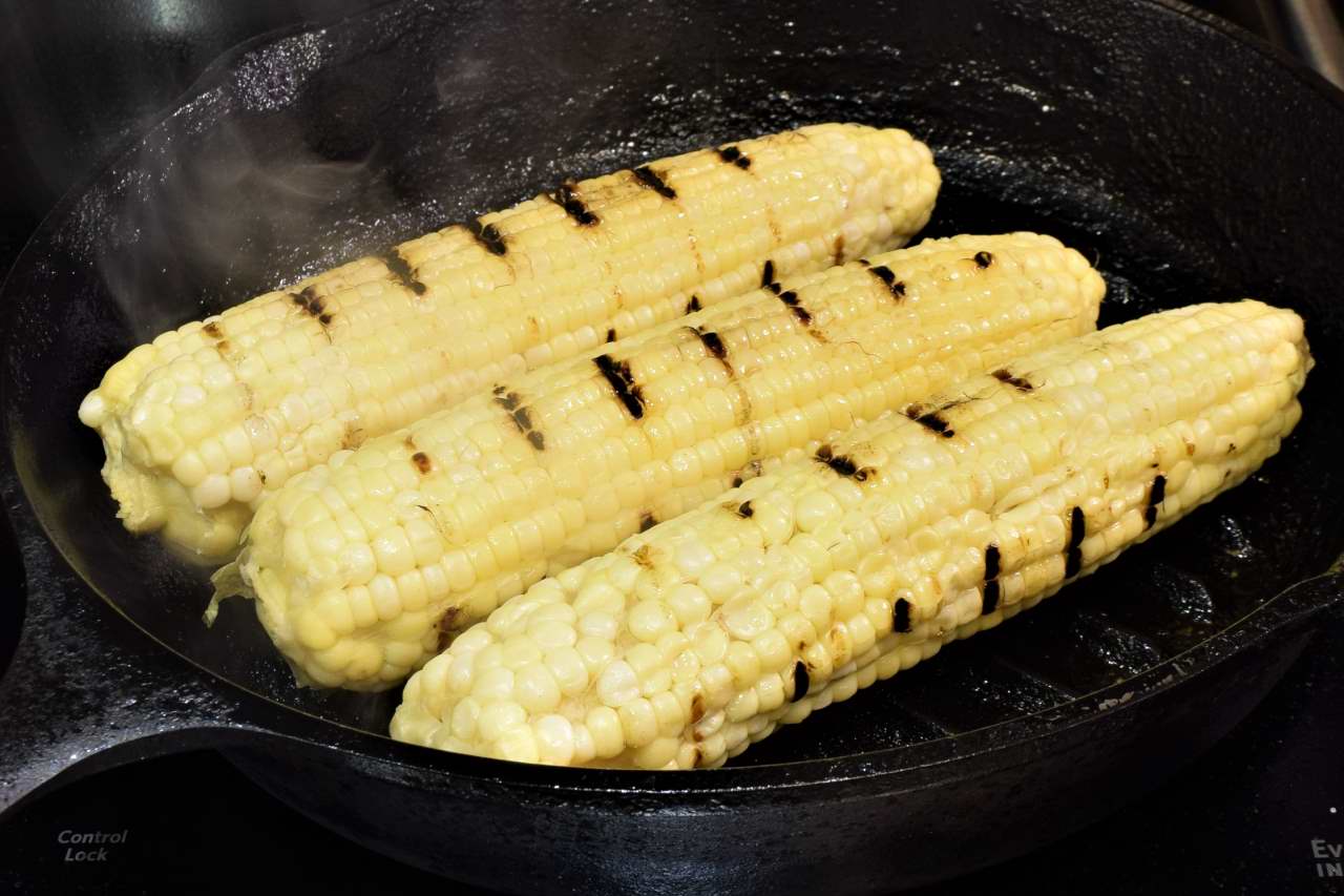 I choose this opportunity to straighten up around the kitchen and catch my breath and my wits. We are almost done. Make the Beurre Monte, if you haven't already. I use a cast iron pan with grates, but any thick bottom pan will work fine. If you want to grill the corn outside, you have my blessing! Try to achieve some dark marks on the corn, it will not scorch easily, and the caramelization adds eye and flavor appeal.