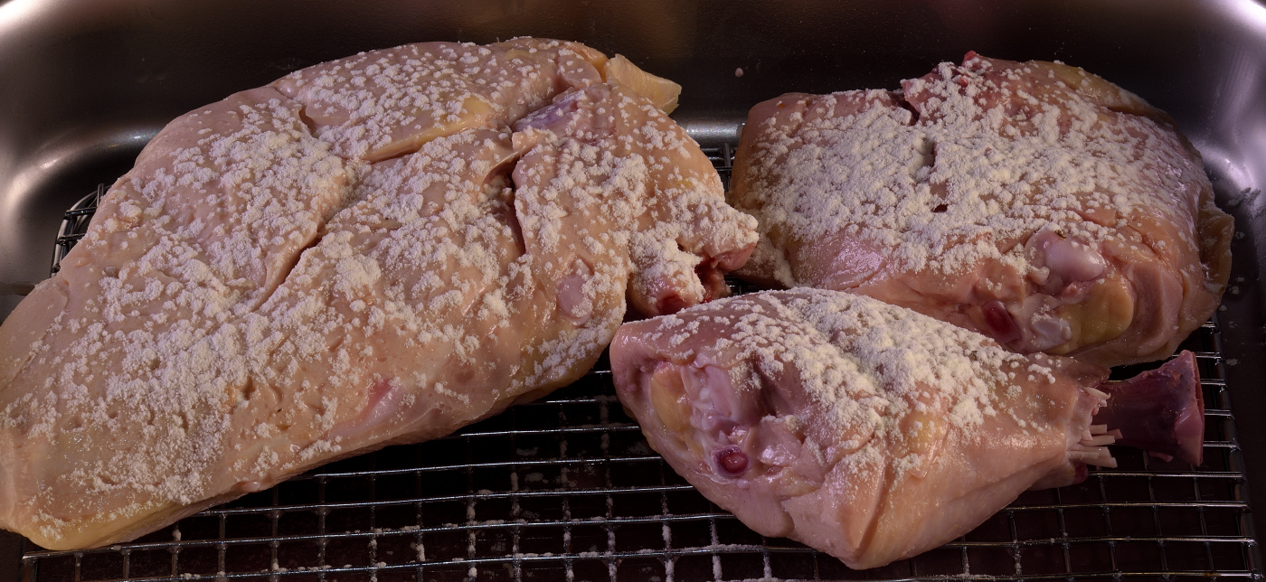Place the chicken on a rack in a pan. Turn the chicken skin side down and dust with powdered egg white. Fresh egg white mixed well with an equal amount of water may also be used.