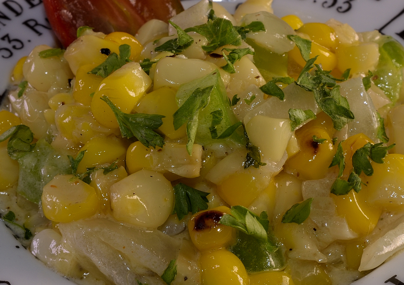 After the processing interval has elapsed, the corn can be served "right out of the bag." Butter, coarse salt and black ground pepper are the standard accompaniments. Alternatively, shock the packages cold in iced/tap water until they achieve 70 F/21 C--approximately half an hour. Refrigerate at 40 F/4 C, and as long as the seal is not broken, the preserved corn can be kept in this state for at least two weeks without harm. It can then be reheated via sous vide or other methods (read on).
