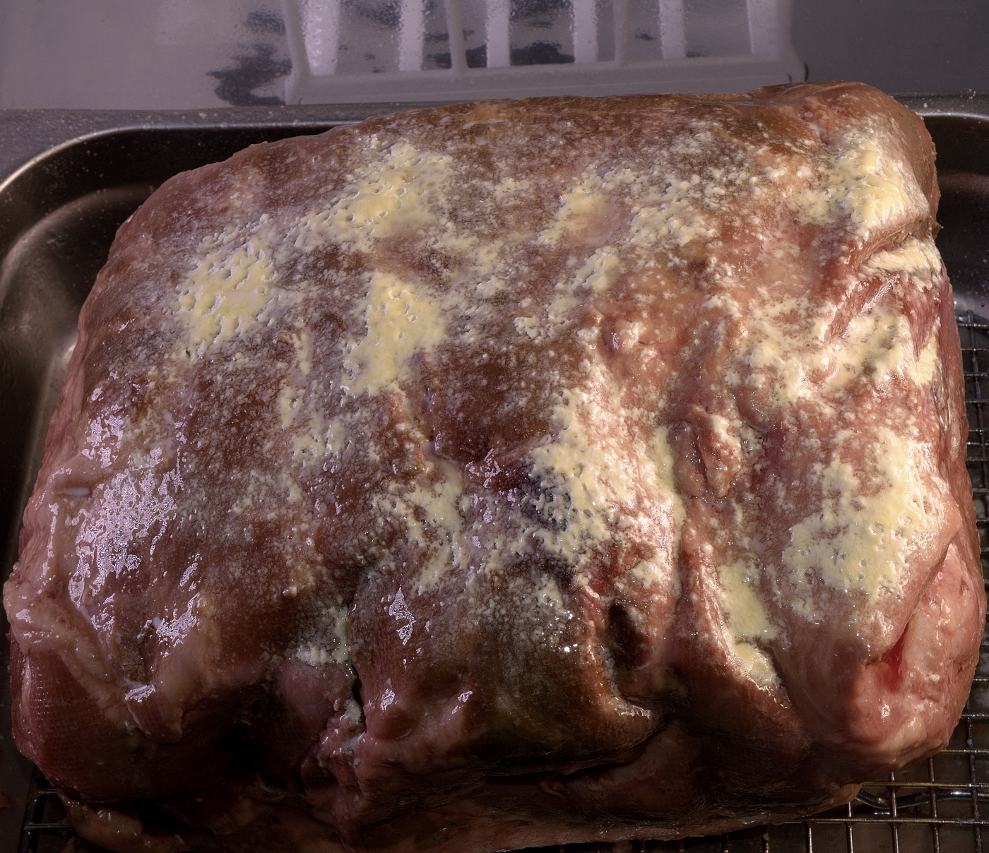 Remove the roast from bag and pat dry with paper towels. We will create a sticky surface so that our rub clings to the roast.