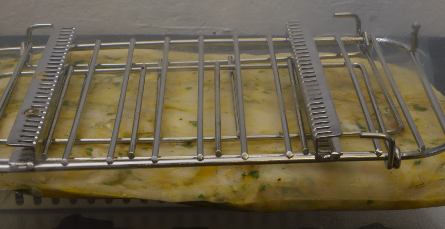 Load the mixture into the sous vide bag(s). After vacuuming, press flat so that the mixture cooks evenly. Keeping the pouch uniformly flat at every step pays off later!