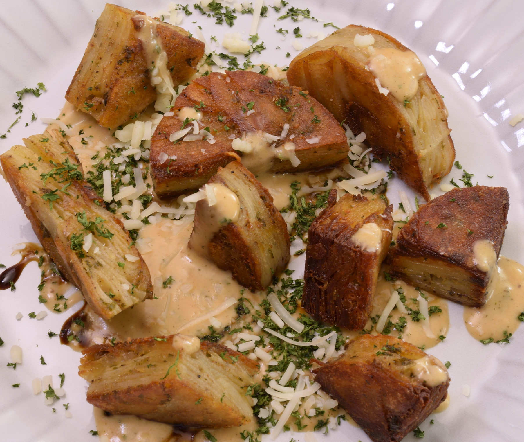 Stage the trim into a pouch and vacuum. Set aside/refrigerate overnight. Heat a seasoned skillet to 350 F/176 C. Carefully stage the cut potato shapes into the pan, one at a time. Make sure to leave space between them so as not to avoid excessive contact--regardless of all of our efforts, the shapes are still fragile.