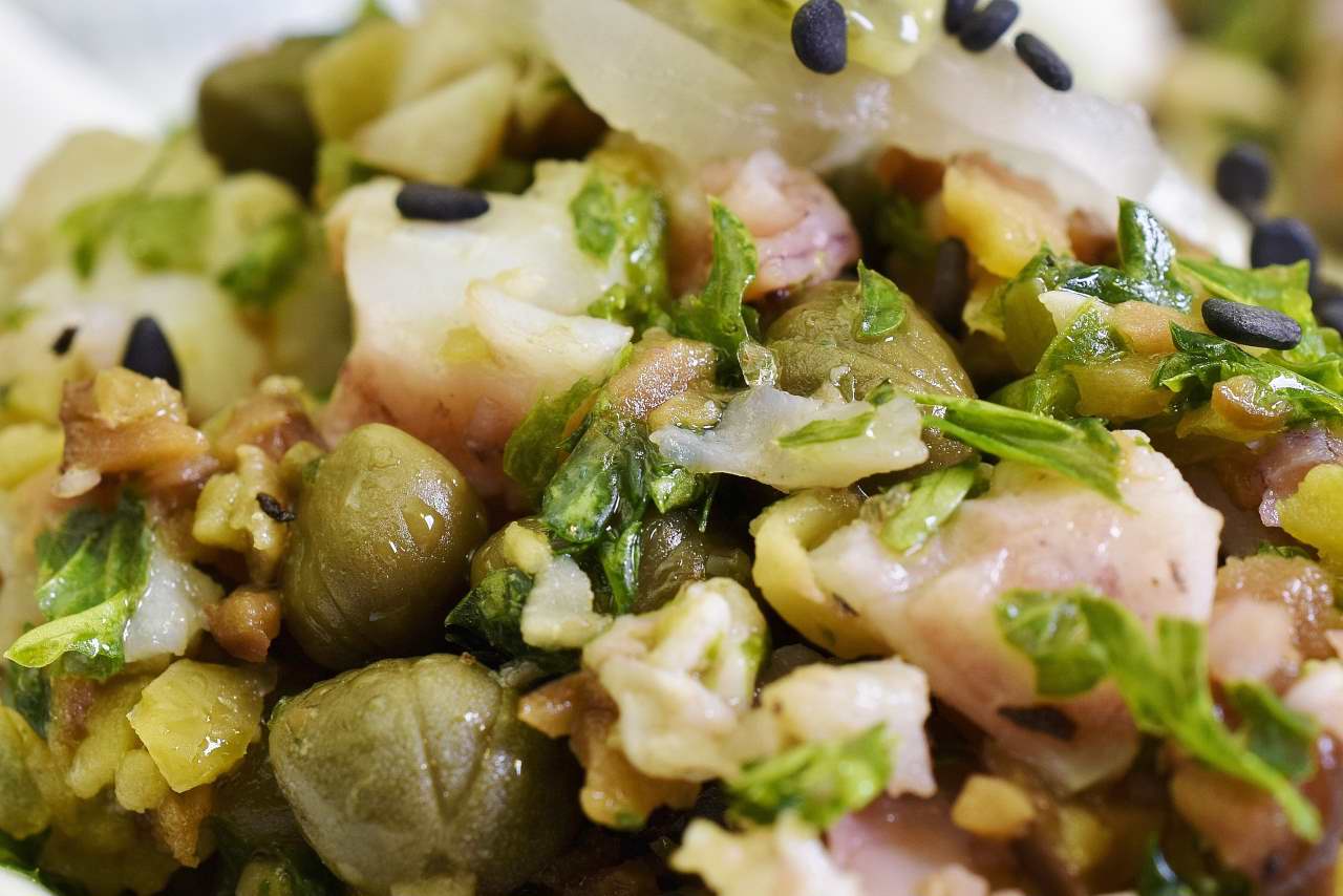 This recipe couples octopus with a Mediterranean style relish. We provide two adaptations, one with angel hair pasta and one as a canapé.