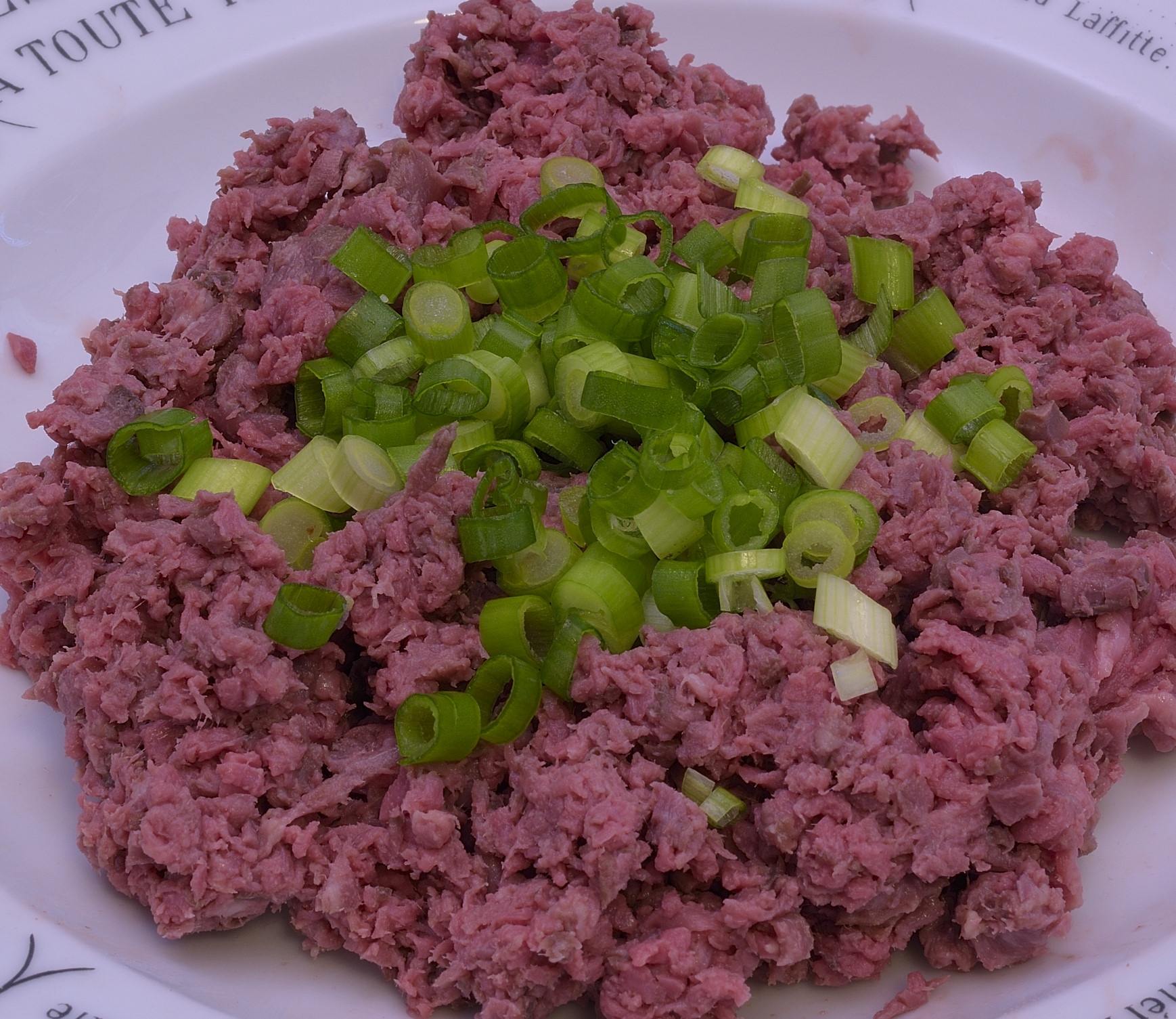 Cut the steak into small cubes, approximately 1"/3 cm. Finish chopping the meat using a food processor on "pulse." Traditional recipes call for chopping the meat by hand, frequently delegated to apprentices or as punishment for impertinent cooks. A meat grinder can also be used utilizing a coarse plate. Avoid chopping the meat too finely. Stage into a shallow bowl.