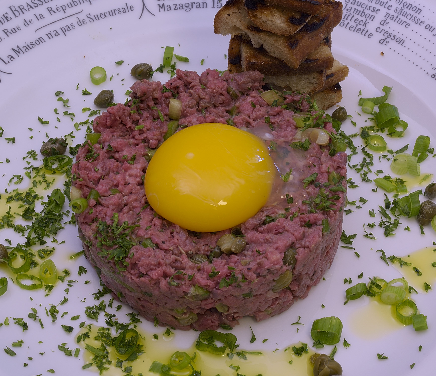 Sprinkle with volcanic black salt (optional) and more parsley if desired. The egg yolk is then ceremoniously mixed into the meat "at table."