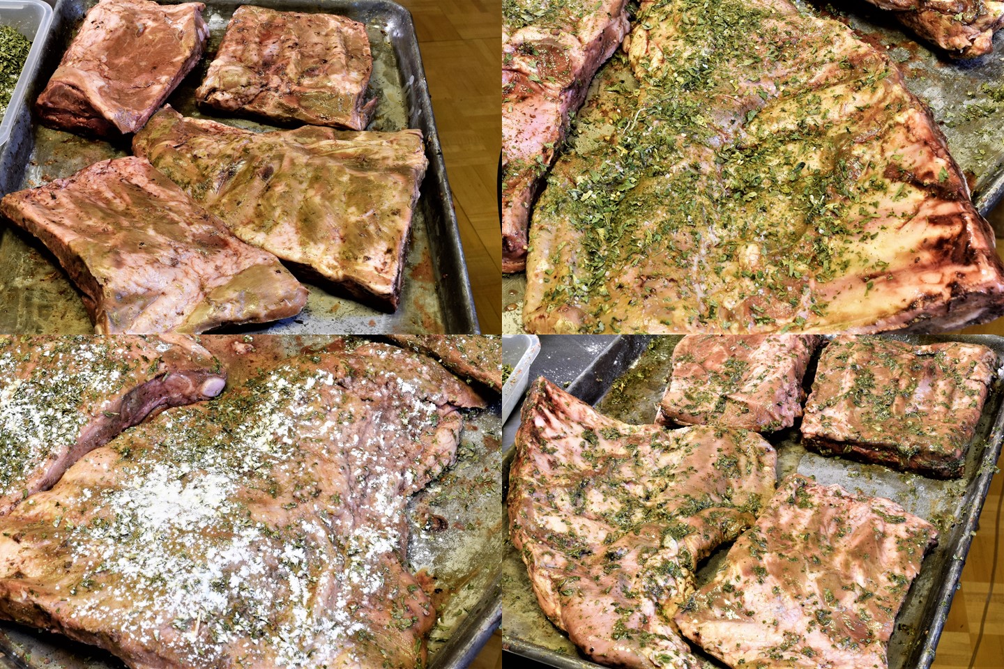 Sprinkle the rub on both sides, and stand the ribs up in racks so that indirect heat comes in contact with all surfaces, not just the top. Smoke or roast @ 180 F/82 C X 4 hours.