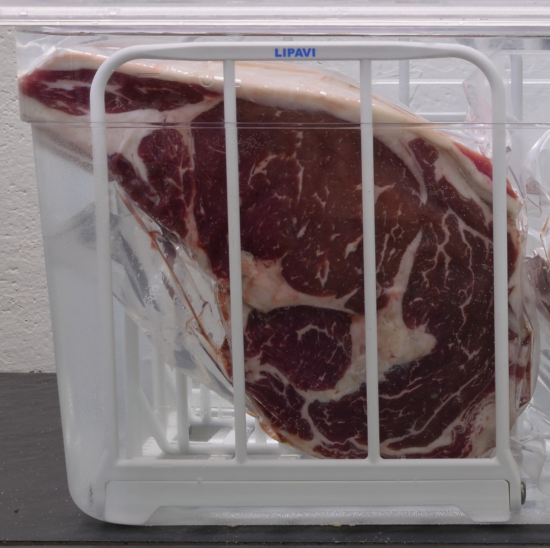 For this demonstration we utilized 64 oz/1800 g from the leanest section of the rib eye where it intersects with the New York/Strip loin. For a detailed pictorial explanation of this, visit HOW TO CUT A WHOLE RIB EYE ROAST INTO STEAKS