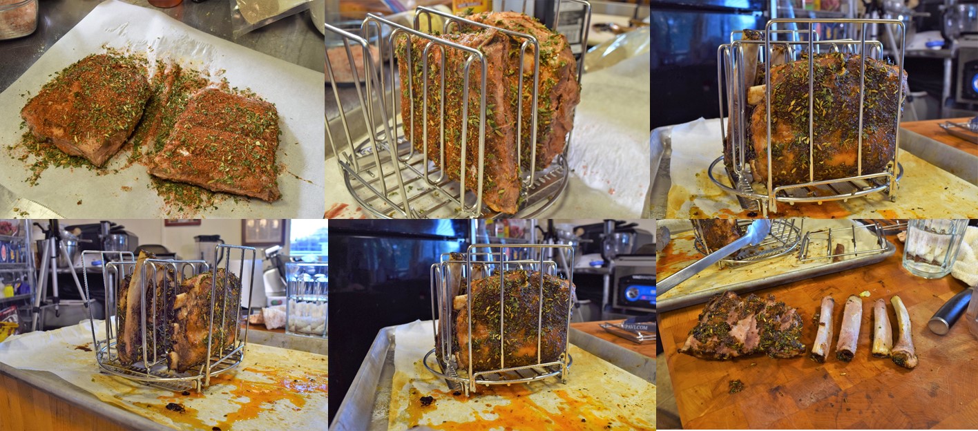 The spare ribs are propped upright in a Lipavi rack for oven roasting. The racks serve to achieve equal crust development over the entire surface of the ribs.