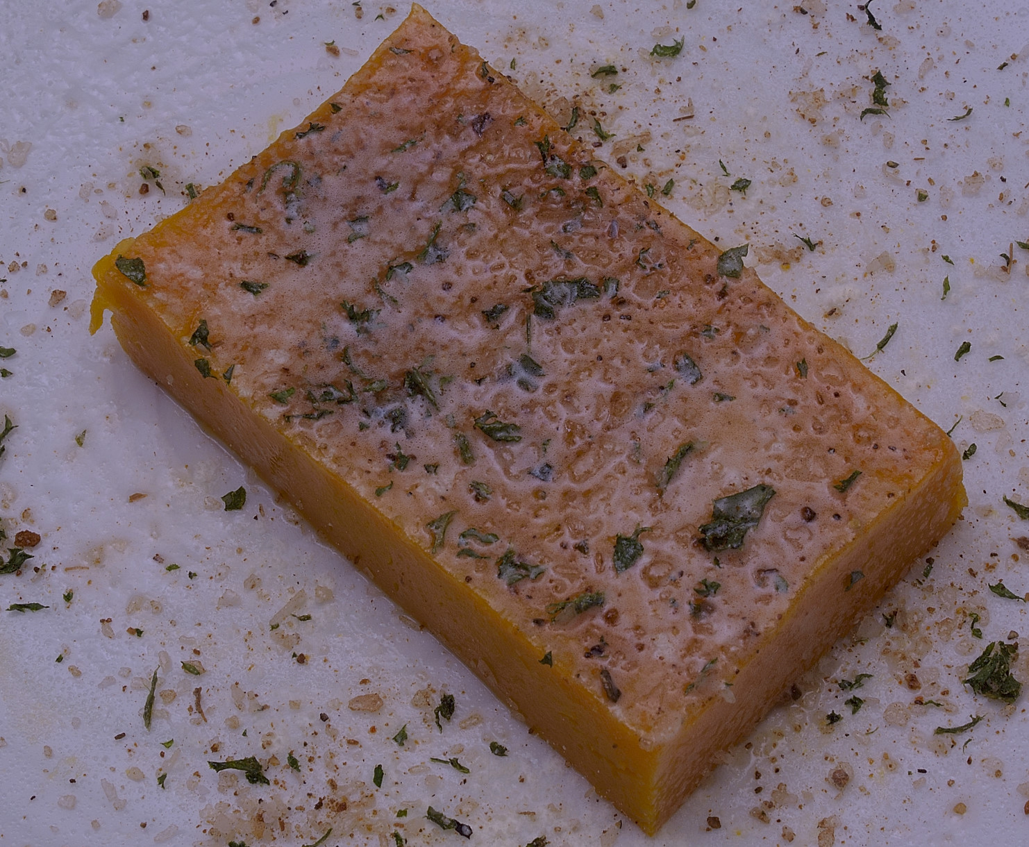 Cut into desired shapes, approximately 0.75"/2 cm thick. Save the trim for other applications like Butternut squash gnocchi or Butternut squash tortellini. Place the individual steaks on a paper towel.