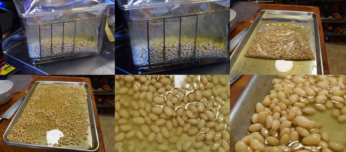 Add the water to beans and process in sous vide bath at 183 F/84 C for two hours. At that point, drain the beans and discard the water. Combine the beans and 12 oz. /360 ml. water again and process at 183 F/84 C for at least 4 hours, or until the beans are fully cooked. Remove from the bag and spread out on a sheet pan to cool. Examine for debris. Separate the beans from the juice and reserve both.
