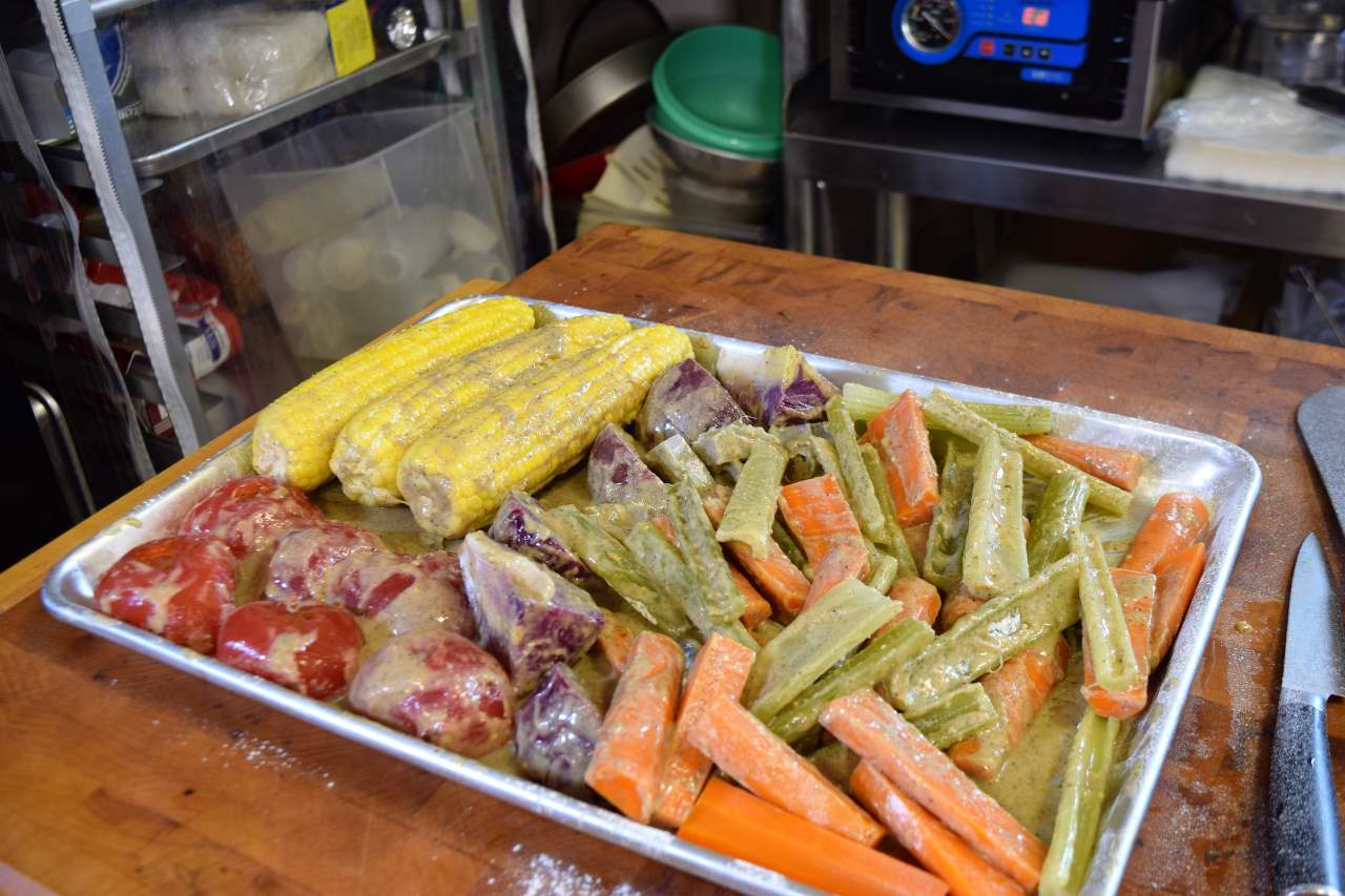 Then, the vegetables are laid out on racks, and transferred to the smoker. Carrots, figs, celery, red onion, corn, and tomatoes.