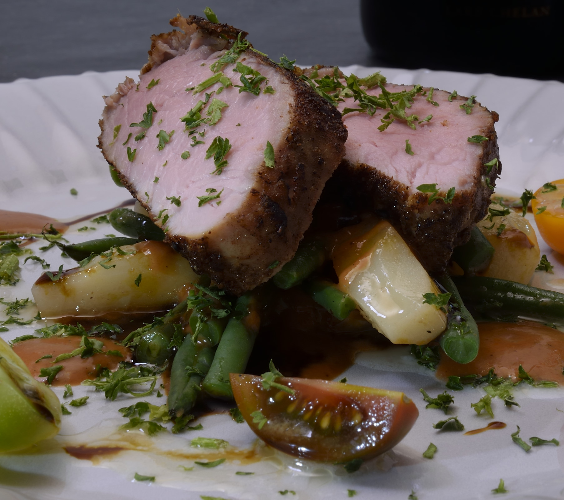 Above: Pork tenderloin, 135 F for 4 hours. Below: Tamarind sauce, haricots verts, heirloom cherry tomatoes, roasted pepper, baguette crouton.